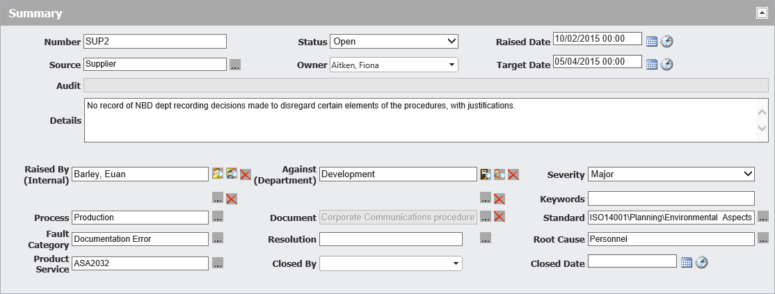 - Process* / Standard* / Fault Category* / Resolution* / Root Cause* / Product Service* - These are more categorisations you can apply to the CA/PA to describe its cause, what was affected, how it was resolved etc.